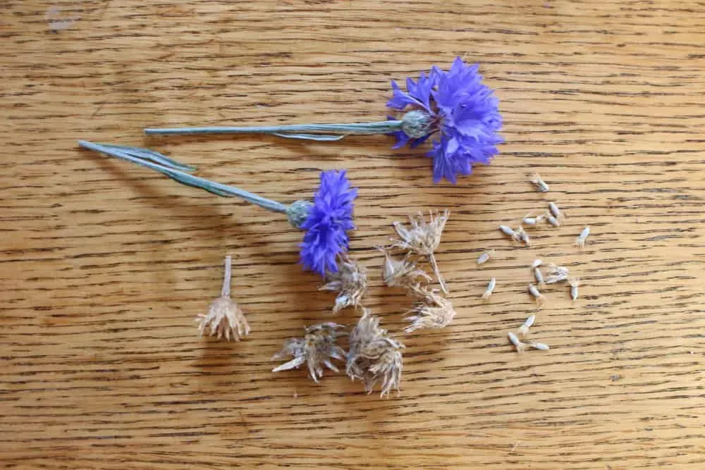 Les graines de bleuet sont de petites graines touffues qui peuvent être retirées des têtes de fleurs séchées, côté touffe vers l’extérieur. Attendez trop longtemps pour les récolter et elles seront déjà tombées et emportées par le vent, nous aimons donc les récolter lorsqu’il reste encore quelques fleurs sur la plante mais qu’elle est encore plus sèche.