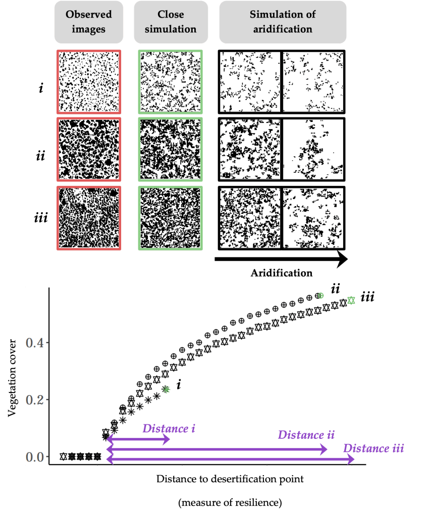 Une fois ces paramètres estimés, nous pourrions alors imiter l’aridification de notre site en augmentant progressivement le stress écologique dans le modèle jusqu’à ce que la désertification se produise. La distance entre l’état estimé du site et ce point de désertification est notre mesure de résilience (voir figure ci-dessous).