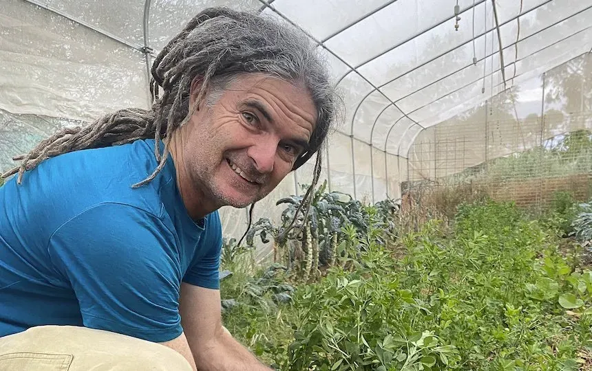 À la périphérie d’Alice Springs en vue de Tjoritja, les MacDonnell Ranges, avec les sables rouges du désert s’étendant sur des milliers de kilomètres depuis sa clôture arrière, Rod Angelo gère un jardin maraîcher.