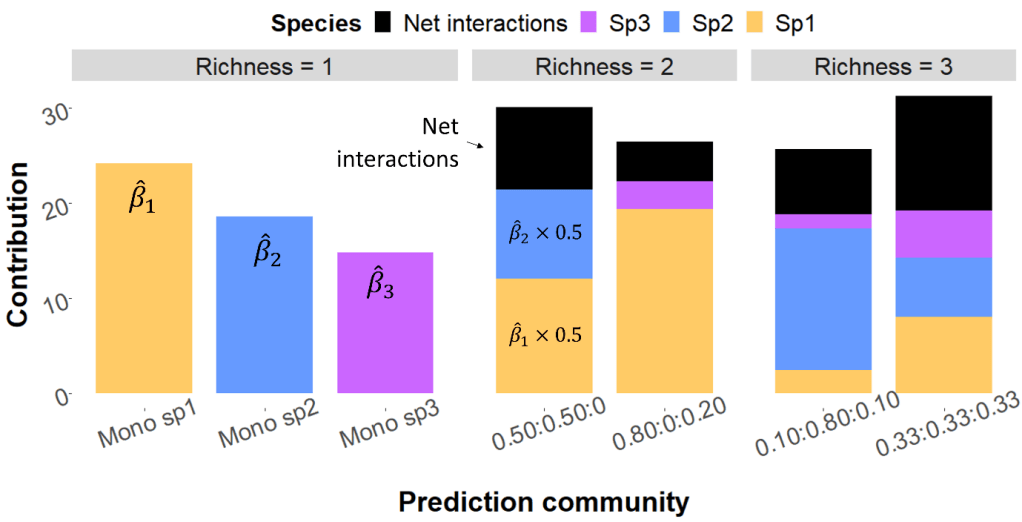 Les modèles Diversity-Interactions (DI), bien qu’ils semblent complexes au premier abord, ne sont en réalité que vos modèles de régression habituels. Ce qui les rend spéciaux est leur hypothèse selon laquelle la principale raison derrière les changements dans les fonctions des écosystèmes (et donc les principaux effets dans un modèle de régression) sont des changements dans les proportions des espèces présentes, plutôt que simplement le nombre d’espèces (richesse) ou tout autre indice unique, par exemple l’uniformité. Comme la somme de ces effets sera égale à un (proportions), aucune constante n’est estimée pour le modèle et une modification d’un effet entraînera toujours une modification d’au moins un autre effet. Cela nous permet de comprendre comment chaque espèce contribue de manière unique à l’écosystème et si cette contribution est affectée par la présence d’autres espèces via des interactions. Ces interactions peuvent prendre de nombreuses formes et la comparaison de ces différentes structures d’interaction constitue souvent l’essentiel des analyses utilisant des modèles DI. Ces modèles peuvent être utilisés à condition de disposer d’un ensemble de données contenant des informations sur la couverture d’une unité d’étude, par exemple les proportions d’espèces dans une parcelle d’un champ, et d’au moins un enregistrement d’une réponse pour chaque unité, par exemple la biomasse végétale. Ces modèles ont été conçus pour être utilisés avec des espèces végétales mais n’ont techniquement aucune restriction dans leur utilisation, par exemple, plutôt que uniquement les espèces végétales dans un champ, nous pouvons inclure le pourcentage de couverture du sol nu en tant qu’« espèce » dans le modèle ! Des informations supplémentaires, comme le type de sol, peuvent également être facilement incluses en tant qu’effets principaux supplémentaires ou être utilisées dans des interactions.