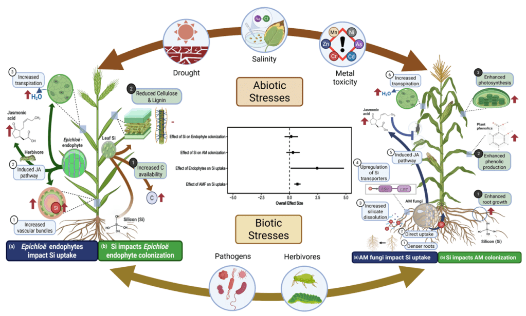 Les champignons AM améliorent l’absorption du Si grâce à des modifications des racines, à la dissolution des silicates dans le sol, à la régulation positive des transporteurs de Si et à la stimulation de la transpiration. Ils activent également des voies de défense telles que la signalisation de l’acide jasmonique, qui est directement liée aux défenses à base de Si. Epichloë les endophytes semblent augmenter la densité des faisceaux vasculaires, influencer les réponses de défense de l’hôte et modifier la transpiration, tout cela favorisant une plus grande accumulation de Si. À son tour, le Si peut favoriser la colonisation fongique en stimulant la croissance des racines, en augmentant la disponibilité du carbone et en modifiant les parois cellulaires.