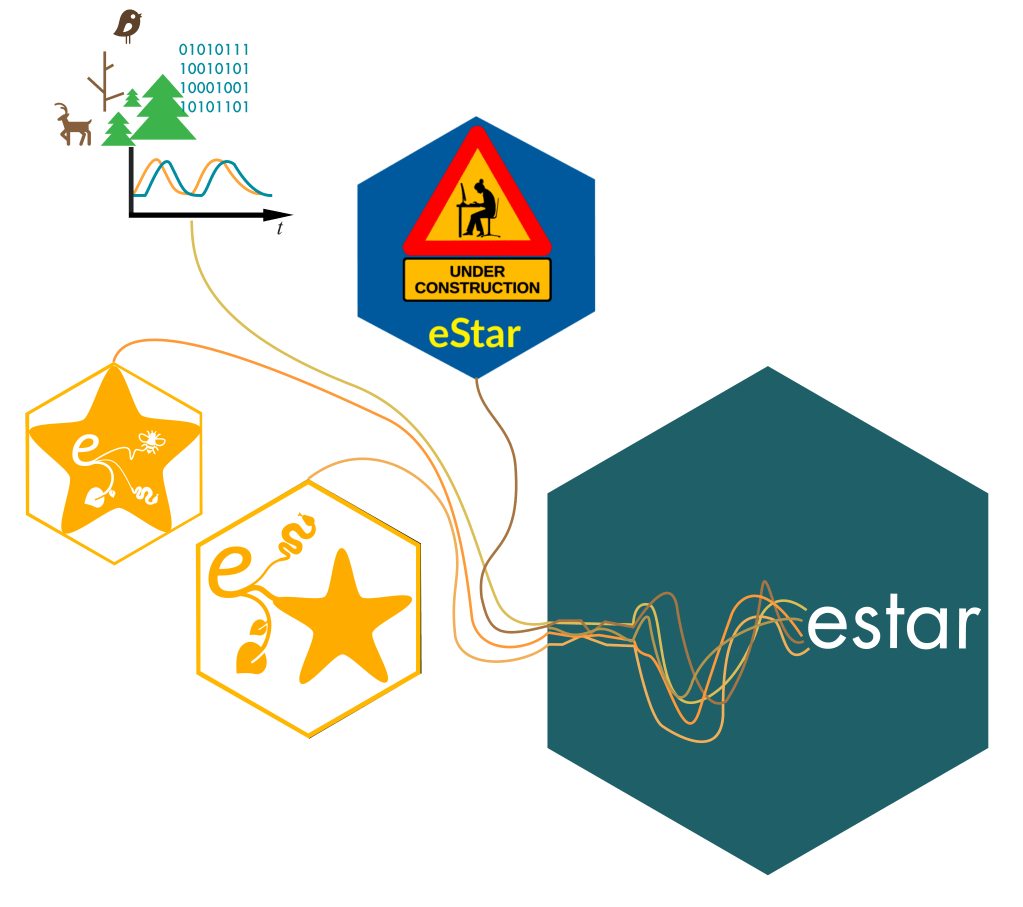 Une autre partie étonnamment amusante du développement d’un package R a été la conception du célèbre autocollant hexagonal. Bien que cela ne soit pas obligatoire, je ne manquerais pas l’occasion de laisser libre cours à mon côté créatif et de résumer les fonctionnalités du package dans une seule image emblématique. Nous avions des versions dans lesquelles nous jouions avec l’écriture de « e-star » pour évoquer les célèbres études de Robert Paine sur les cascades trophiques impliquant le Pisastre étoile de mer. En fin de compte, cependant, mes capacités de conception très limitées m’ont amené à choisir un hexagone, certes, d’apparence plus conservatrice, mais qui traduit notre espoir pour ce projet : qu’une variété de dynamiques de systèmes puissent être prises en compte et étudiées avec estar.